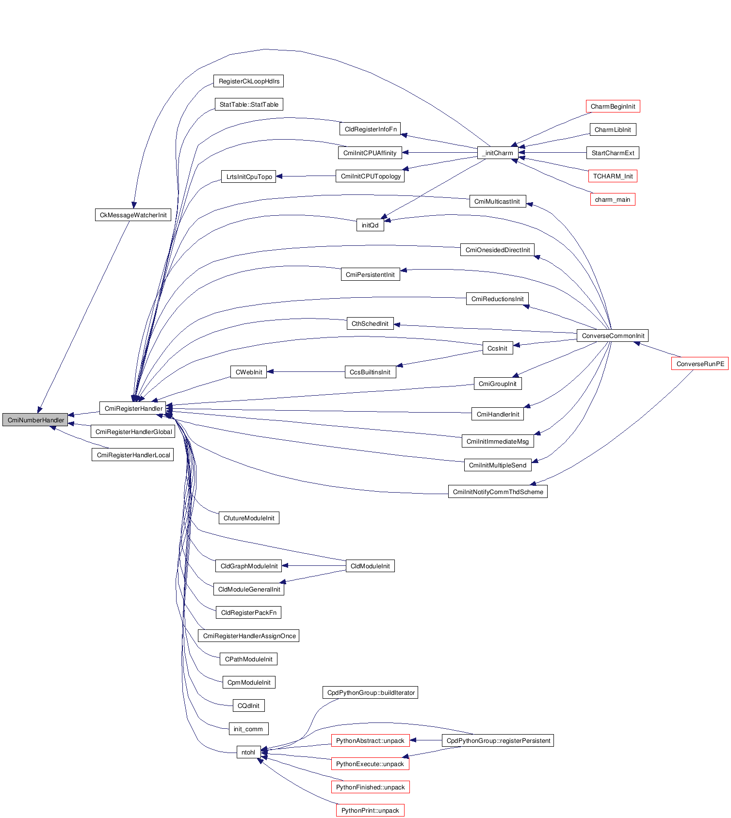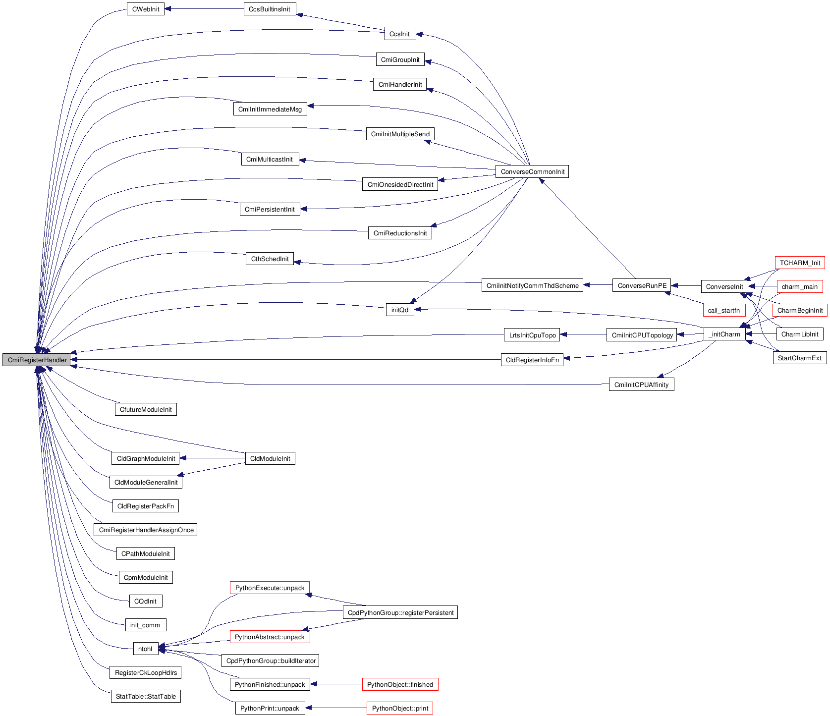 Initialization is somewhat subtle, in that various modules won't work properly until they're initialized. For example, nobody can register handlers before calling CmiHandlerInit.